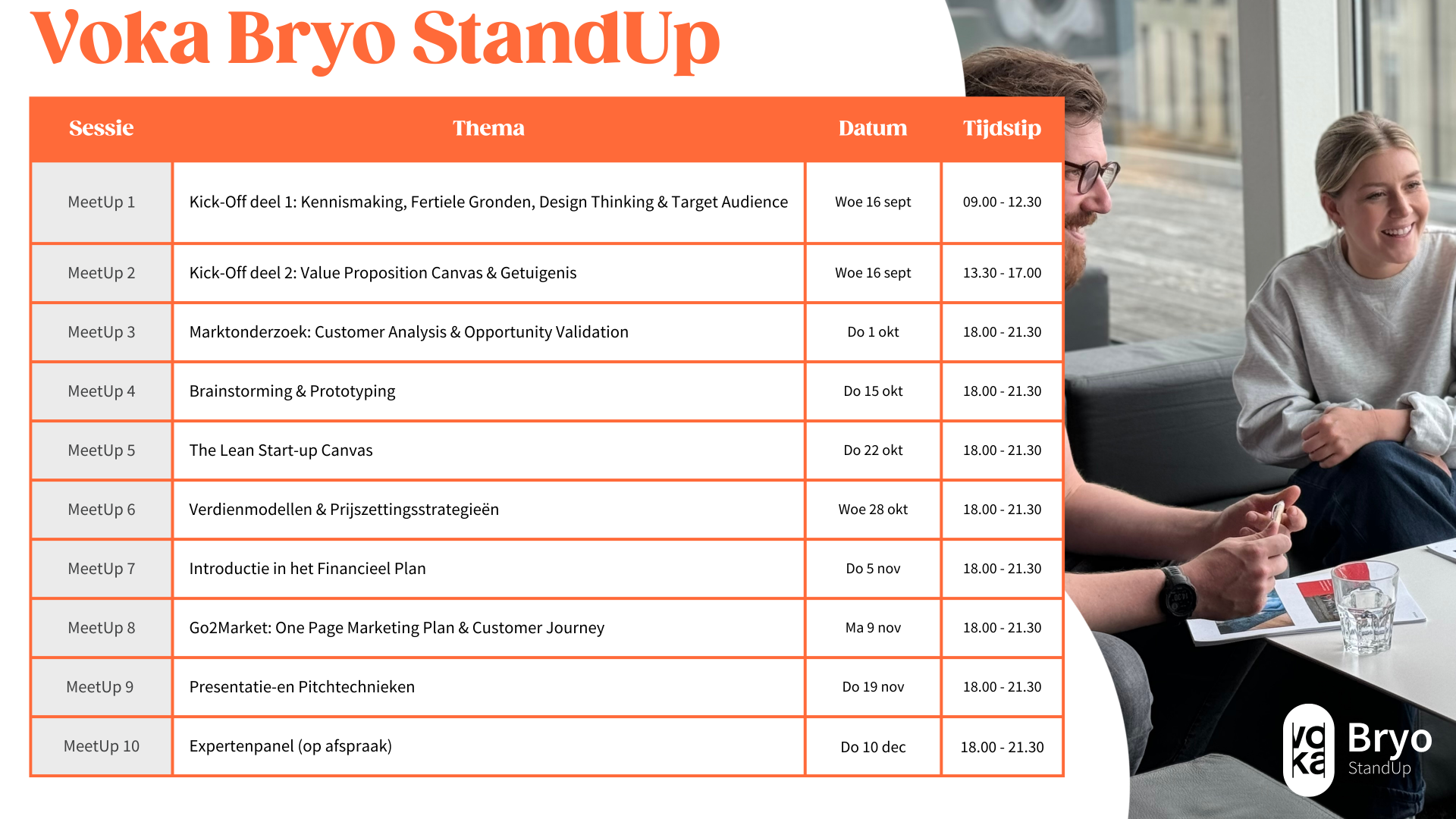Het volgende StandUp traject gaat van start in november 2025. De sessies zullen telkens 's avonds doorgaan van 18u tot 21u30, behalve anders gecommuniceerd. Enkel de kick-off van het traject zal overdag doorgaan van 9.00u tot 17.00u. Alle sessies gaan door in de Voka Box te Gent.