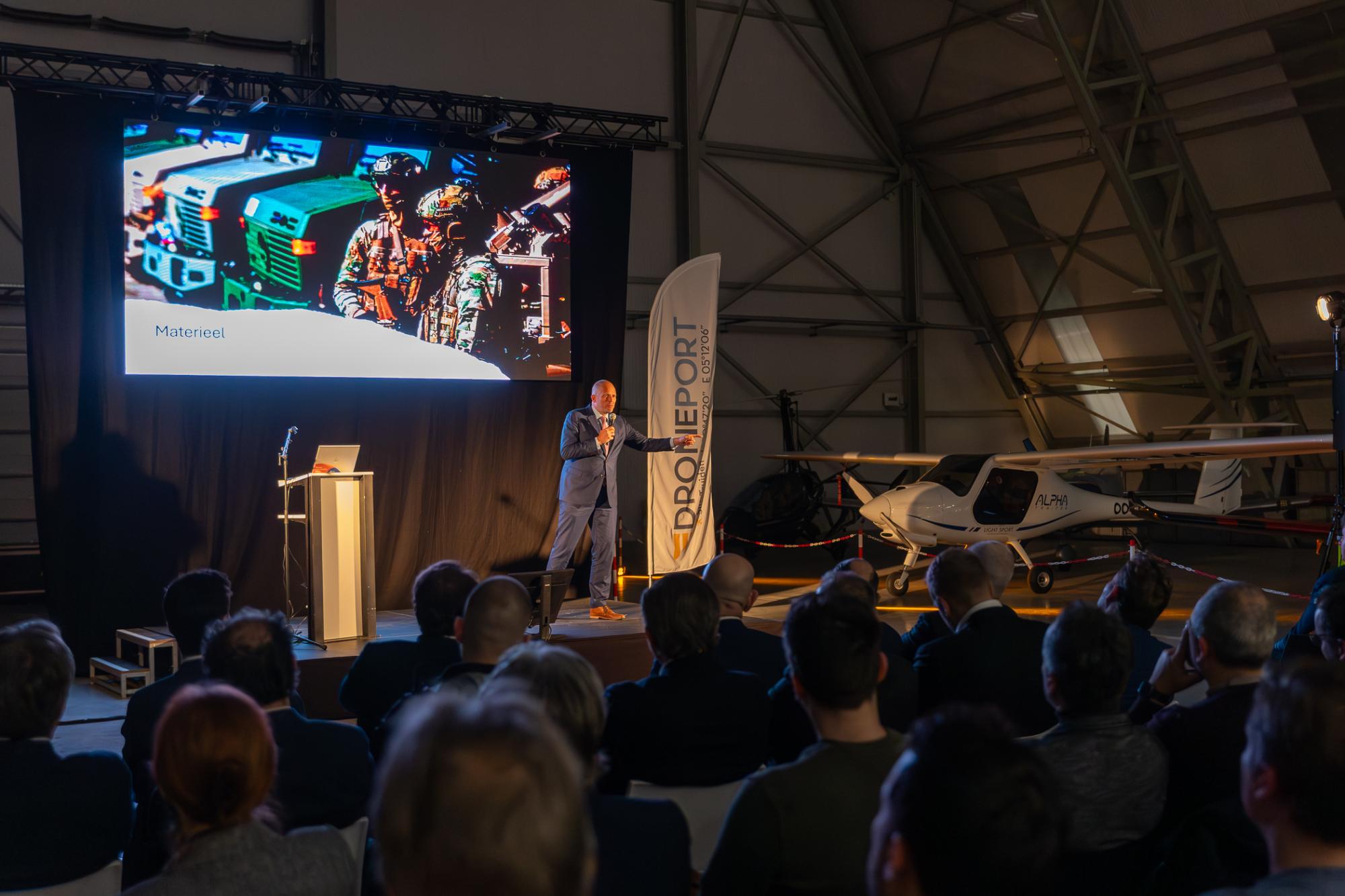 Defensieminister Theo Francken en de top van het Belgisch leger die de contouren en investeringsprogramma’s toelichten waar defensie en de ondernemers van Limburg mekaar kunnen vinden. Dat is het opzet van de roadshow die Voka – KvK Limburg, de minister en de legertop bij DronePort in Sint-Truiden organiseerden. Het wereldwijde testcentrum voor de drone-industrie is een belangrijke groeimotor voor de verdere ontplooiing van de defensie-industrie in ons land.