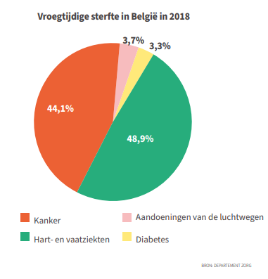 Vier chronische aandoeningen (hart- en vaatziekten, kanker, longlijden en diabetes) veroorzaken 90% van de sterfgevallen en 85% van de jaren in minder goede gezondheid in België. Deze grote vier kosten 24 miljard euro aan gezondheidsuitgaven, 8 miljard euro aan ziekte-uitkeringen en betekenen 11,5 miljard euro aan economisch verlies door afwezige medewerkers. Strategisch inzetten op preventie kan de kosten door ziekte met 20% beperken.